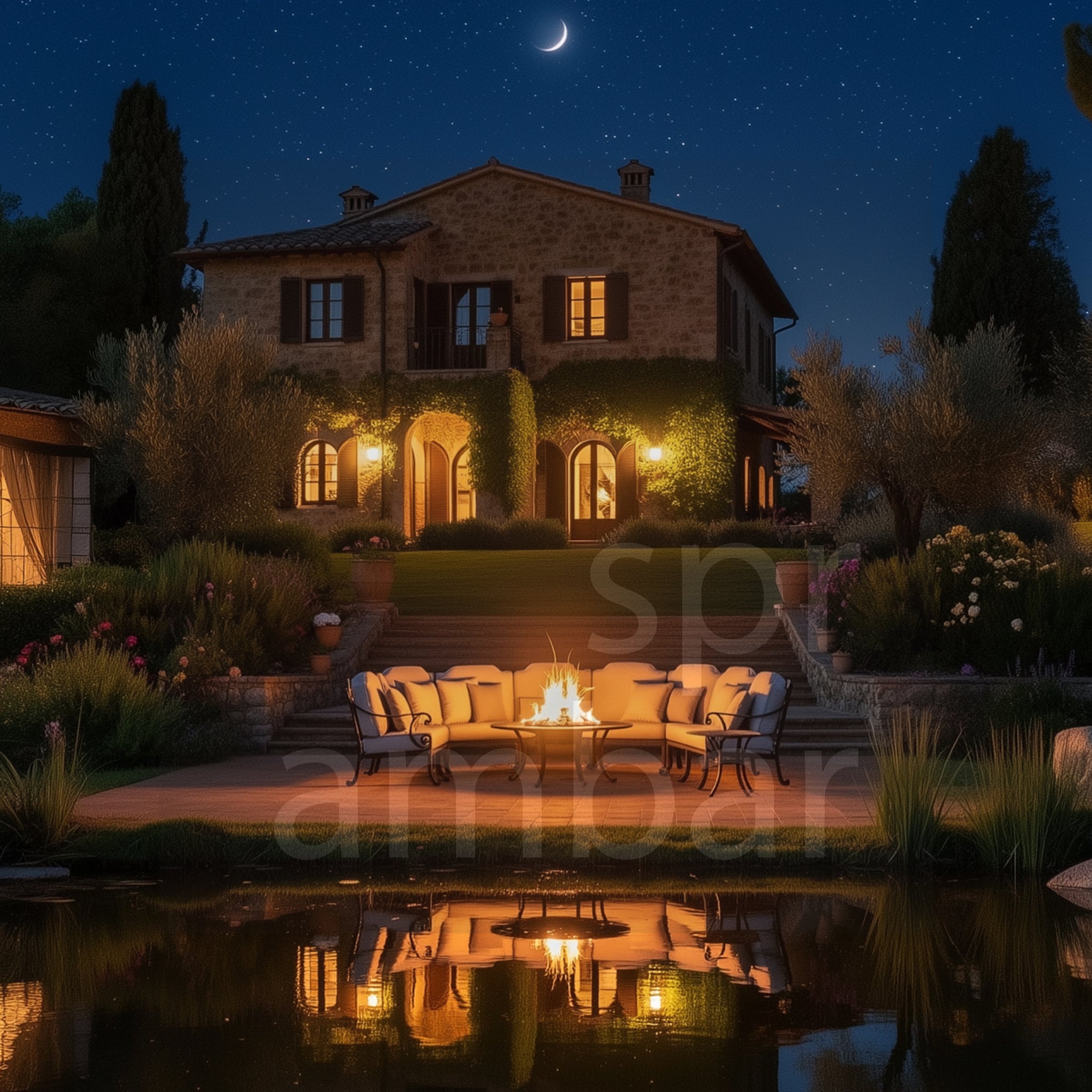 Mangallı orta sehpa (firepit), modüler köşe düzeninin merkezinde yer alır. Ateş, yalnızca ısı kaynağı olarak değil; etrafında toplanılan sosyal bir odak noktası olarak işlev görür. Köşe formu, ateşle birlikte mekânda doğal bir yakınlık hissi yaratır. Uzayan akşamlar, sessiz sohbetler ve paylaşılan anlar için sahne her seferinde yeniden kurulur.