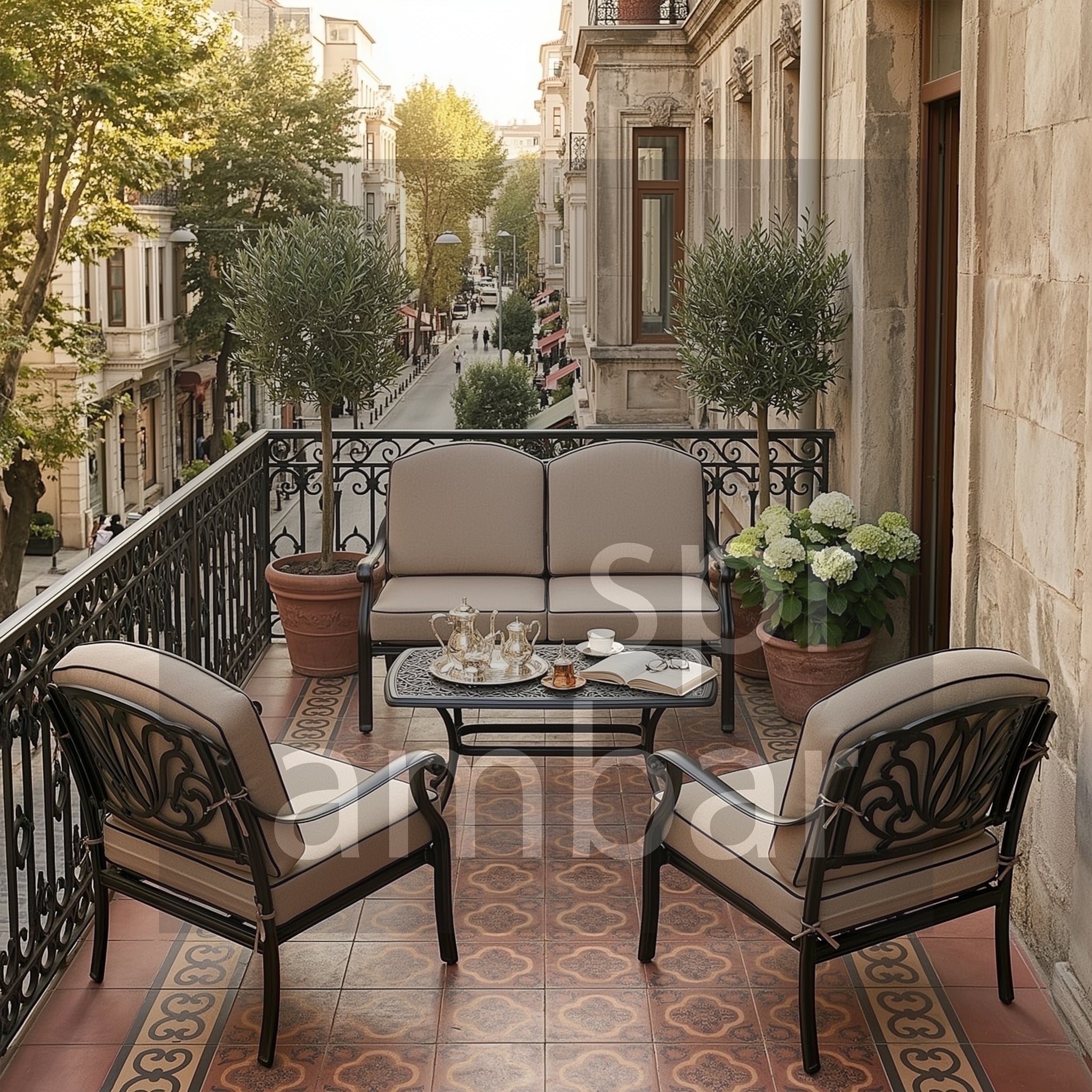 Spring Koltuk Takımı Small, küçük bahçe alanları için mükemmel bir çözümdür. Kompakt formuna rağmen güçlü bir yapıya sahiptir. Cast aluminum frame, dayanıklılık ve hafifliği bir araya getirir; el işçiliği kaynak detayları her bir parçaya zanaatkâr bir değer katar.
