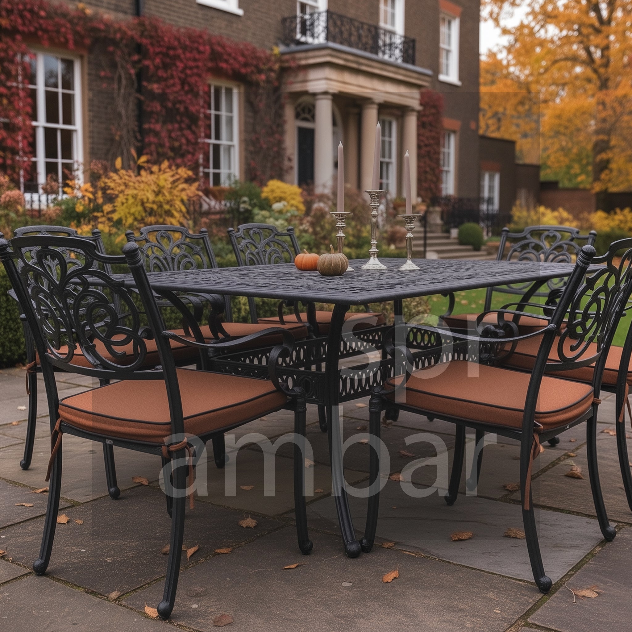 Pier 18 8 Kişilik Masa Takımı, klasik tasarımın dengeli zarafetini dış mekâna taşır. Mat acı kahve zemin üzerine serpiştirilmiş altın yansımalar, ışığın yönüne göre masada sıcak bir parıltı oluşturur. Bu altın noktalar, Pier 18 Koleksiyonu’nun karakteristik imzasıdır — abartısız ama etkileyici bir lüks.